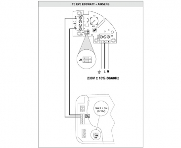 - Скорость вентиляторов регулируется в диапазоне от 10% до 100% при помощи потенциометра, расположенного в клеммной коробке или при помощи внешнего потенциометра REB-ECOWATT (опция).